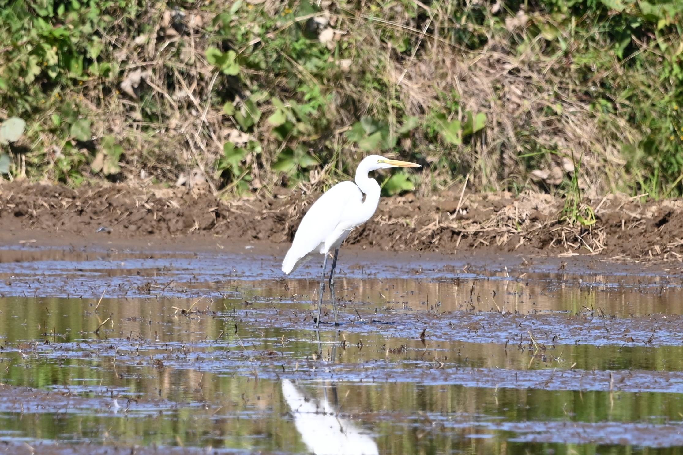 恐らくダイサギと思われます。新宿御苑で紅葉の中で見つけたときも美しいと思いましたが,やはり田園風景が似合いますね。